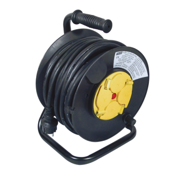 Enrouleur prolongateur avec tambour plastique choc équipé de 4 prises 10/16A à clapets et capots de protection.