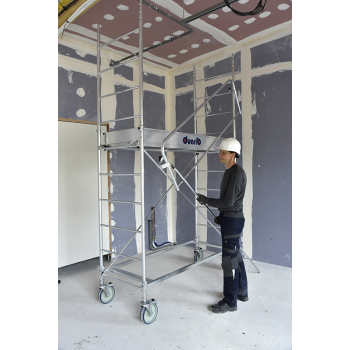 Acier galvanisé. Hauteur de travail de 3.80 m jusqu'à 8.80 m. Conforme à la Réglementation Française/ Décret 2004-924. Norme NF EN 1004-1. Implantation ultra rapide. Montage et démontage en sécurité par un opérateur. Stabilisateur unique toutes hauteurs, montage depuis le sol, à réglage millimétrique. Ø des montants : 35 mm. Longueur : 2,00 m - Largeur : 0,69 m. Dim extérieures : Long : 1,97 m - Larg : 0,80 m. Plancher alu/bois - 1 trappe - plinthes alu intégrées. Surface utile : 1,70 x 0,56 m. Charge maxi admissible sur 1 plancher : 190 kg. Roues ø 200 mm réglables sur 20 cm tous les 25 mm. Installation en dénivelés maxi de 1.40 m sans ajout de pièces optionnelles. Passage des portes de 0.83 m facilement en position chariot.