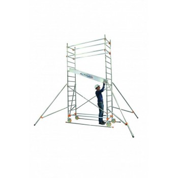 Le spécialiste de l'intérieur. Aluminium. Hauteur de travail jusqu'à 9.90 m. Longueur plancher 2.05 m.-largeur 0.69 m Conforme à la Réglementation Française / Décret du 01/09/04 - Norme NF EN 1004-1.Montage et démontage en sécurité par un opérateur. Base fixe. Protection par lisses et sous-lisses ou par garde-corps monoblocs. Passage des portes de 0.83 m. Dim. extérieures : Long : 2,15 m - Larg : 0,79 m. Plancher bac alu/bois, plinthes aluminium intégrées, une trappe, verrouillage sécurité, ou plancher modulaire alu/bois, plinthes bois amovibles, une trappe, verrouillage sécurité. Surface utile 0,56 x 1,90 m. Charge maxi admissible sur un plancher : 209 kg. Stabilisateur unique pour toutes les hauteurs. Roues Ø 200 mm réglables sur 150 mm tous les 10 mm. Installation en dénivelés maxi de 1.00 m. Ø des montants : 45 mm.