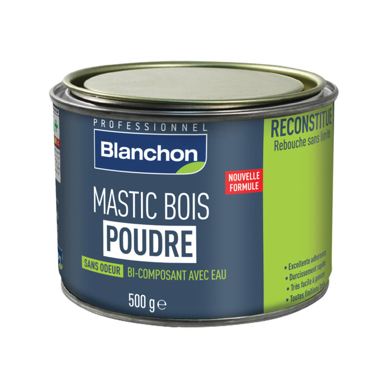 Mastic sans odeur bi-composant avec eau : rebouche les trous et les fissures de toutes tailles et reconstitue des parties manquantes. Formule biosourcée selon la norme NF EN 16640.